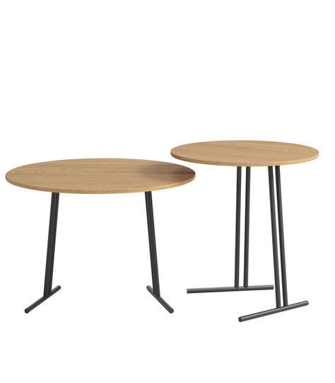 The larger table can be used as a coffee table, and the smaller one as an auxiliary table. The table tops are made of oak veneer lacquered in a mat.